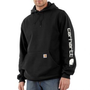 Our midweight hooded logo-sleeve sweatshirt comes in great colors. Made of a 10.5-ounce, 50% cotton/50% polyester blend, it features an attached hood with draw-cord closure, front hand-warmer pocket, spandex-reinforced rib-knit cuffs and waistband. The Carhartt logo is printed on the sleeve and a logo patch is sewn on the pocket.